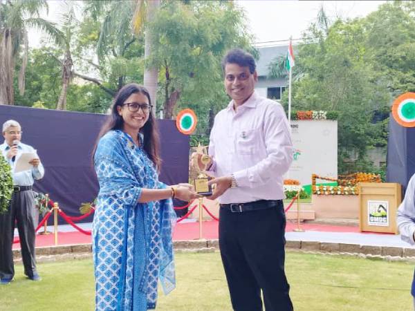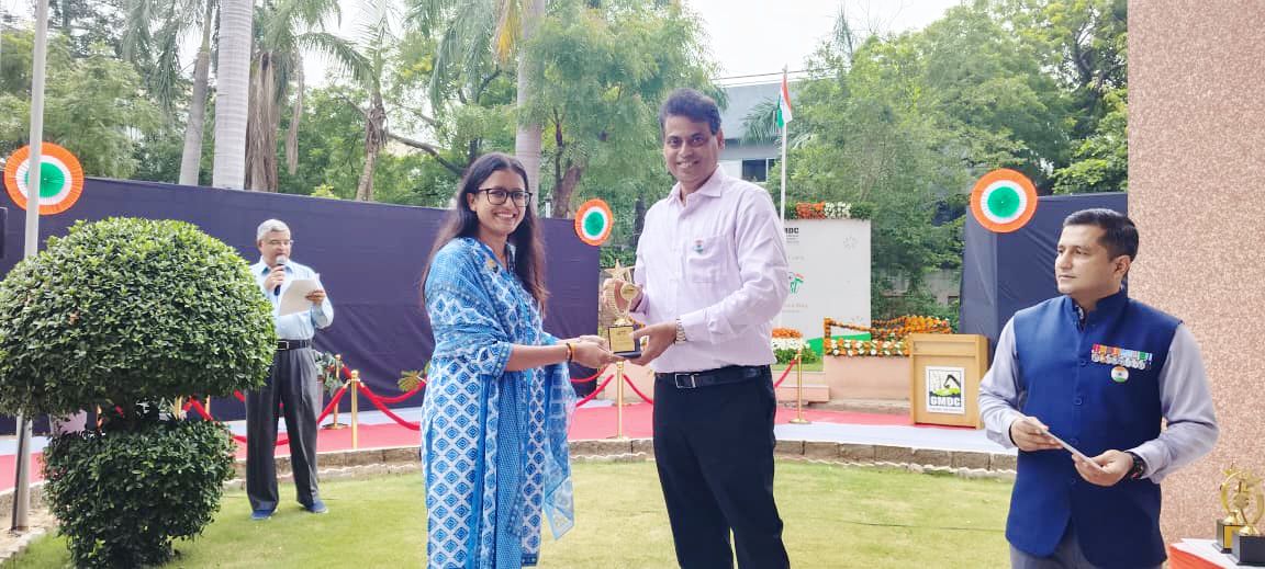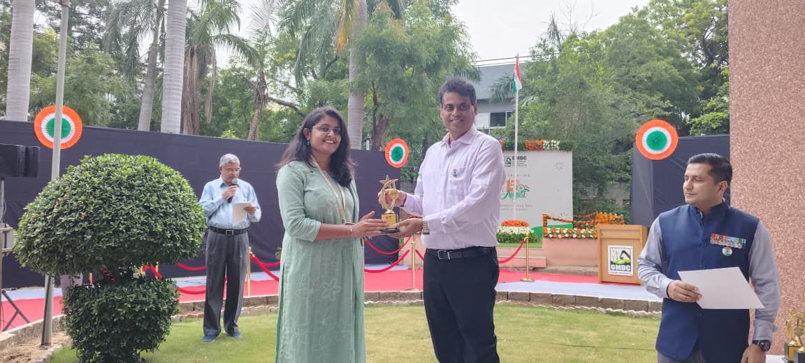 On the occasion of Independence Day, GMDC organized an award giving ceremony for the group of nominated outstanding employees. In this regard, two employees (Ms. Yesha Pandya, Sr. Assistant-Finance and Ms. Krupa Chauhan, Geologist-Ambaji) from GMRICS were honored for their exceptional contribution and dedication towards the organization.